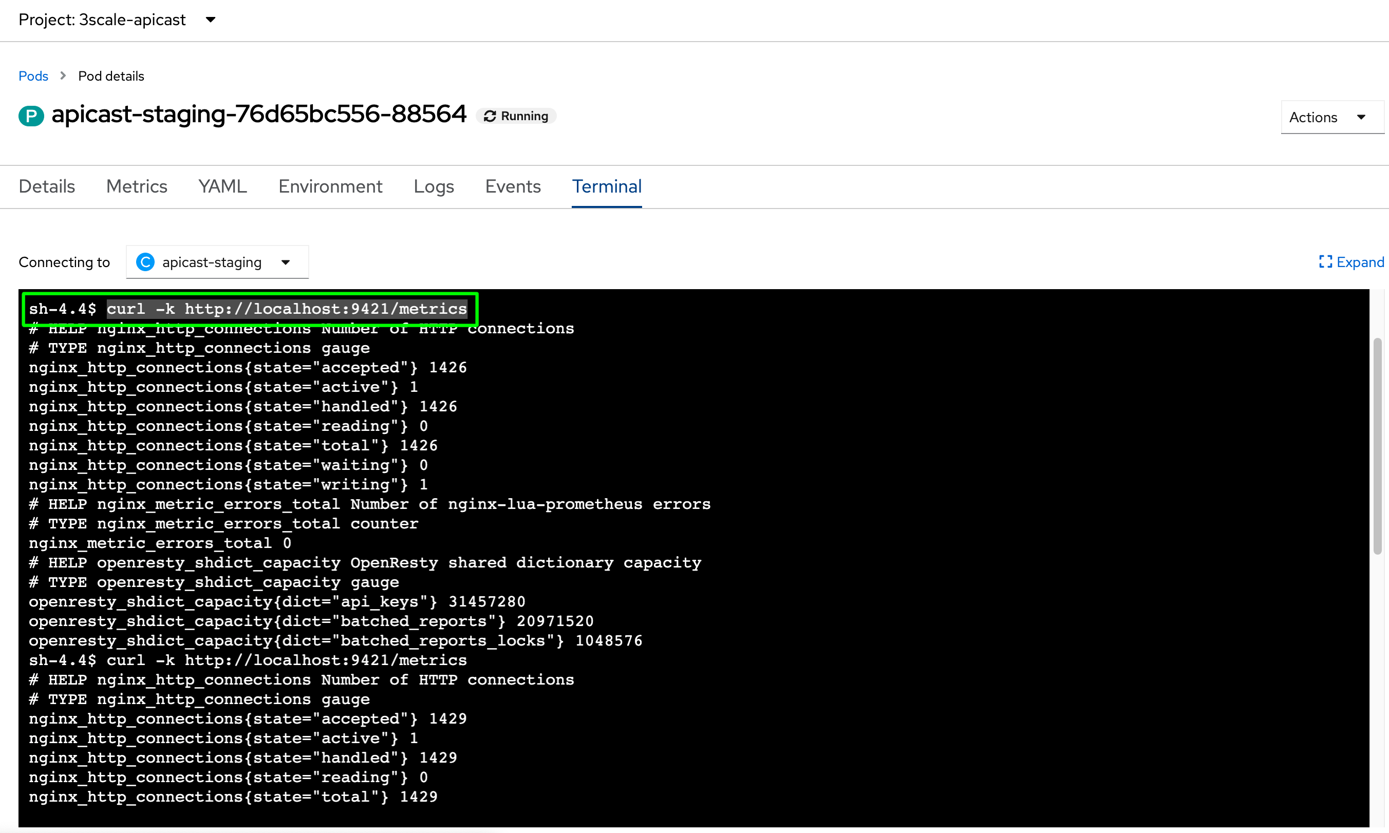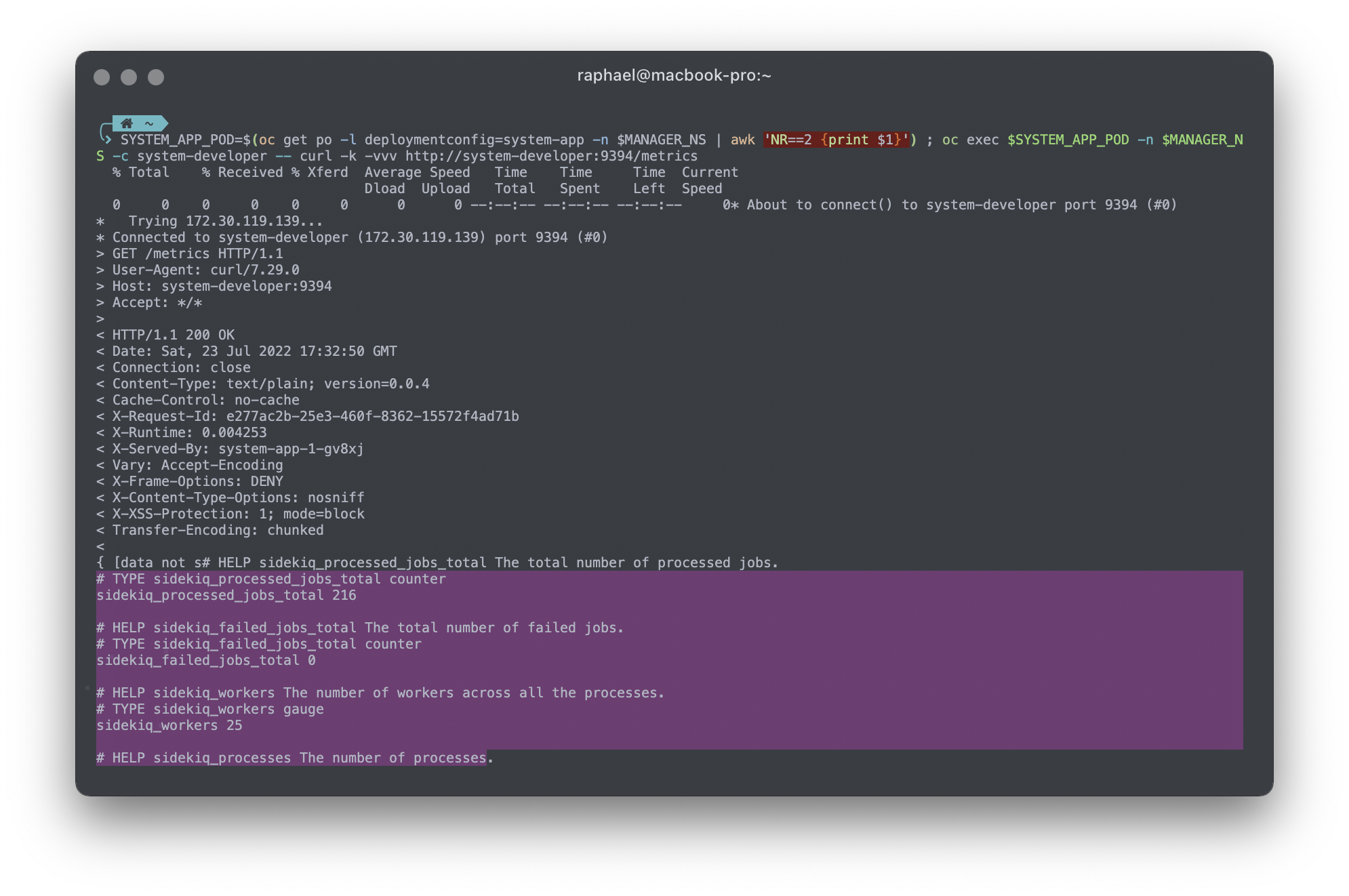 SYSTEM_APP_POD=$(oc get po -l deploymentconfig=system-app -n $MANAGER_NS | awk 'NR==2 {print $1}') ; oc exec $SYSTEM_APP_POD -n $MANAGER_NS -c system-developer -- curl -k -vvv http://system-developer:9394/metrics