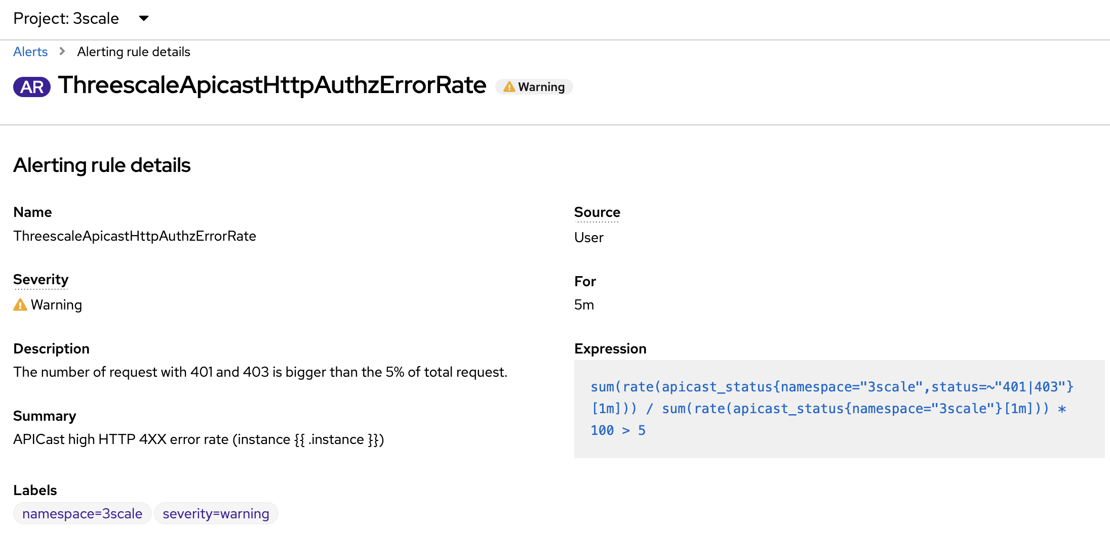 expr: sum(rate(apicast_status{namespace='$MANAGER_NS', status=~"401|403"}[1m])) / sum(rate(apicast_status{namespace='$MANAGER_NS'}[1m])) * 100 > 5