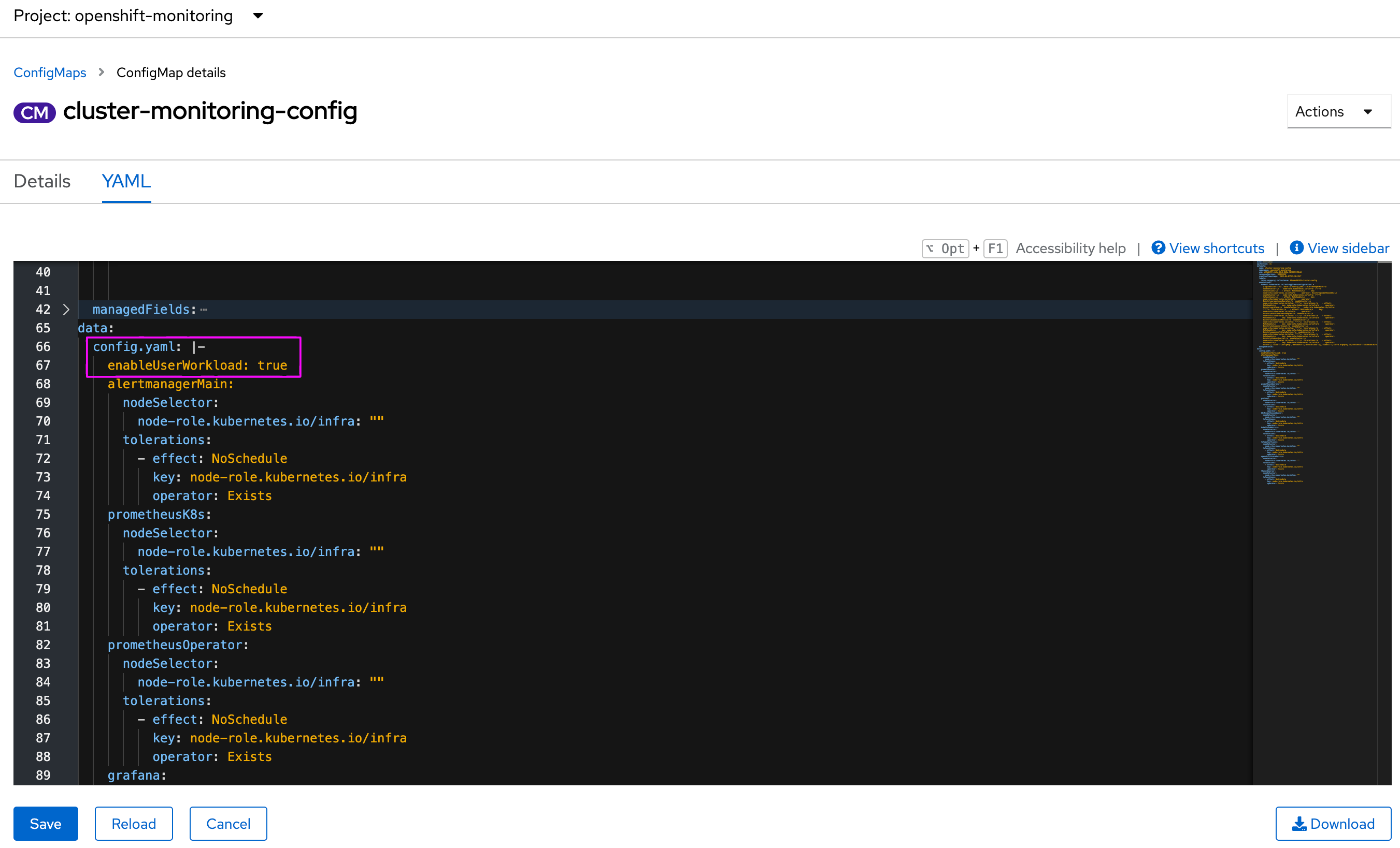 First, let’s configure the cluster-monitoring-config config-map to enable OpenShift to monitor all user workload. This can be achieved with the following code: