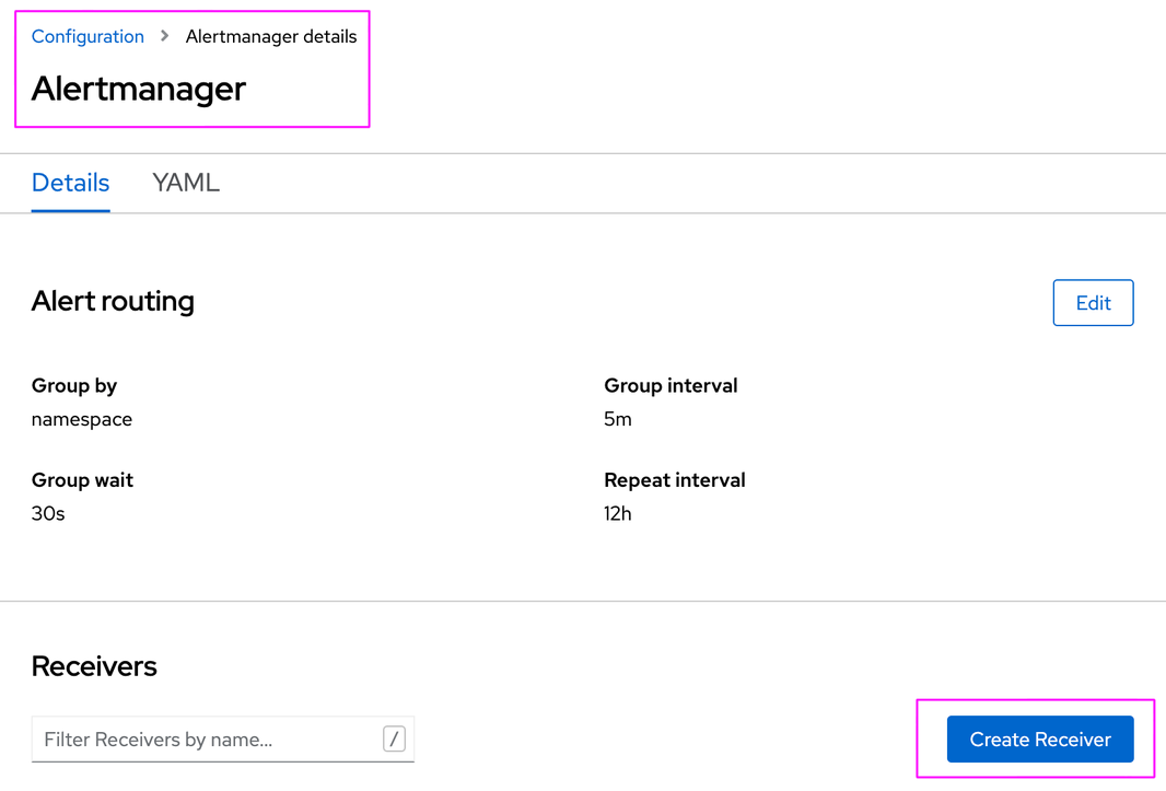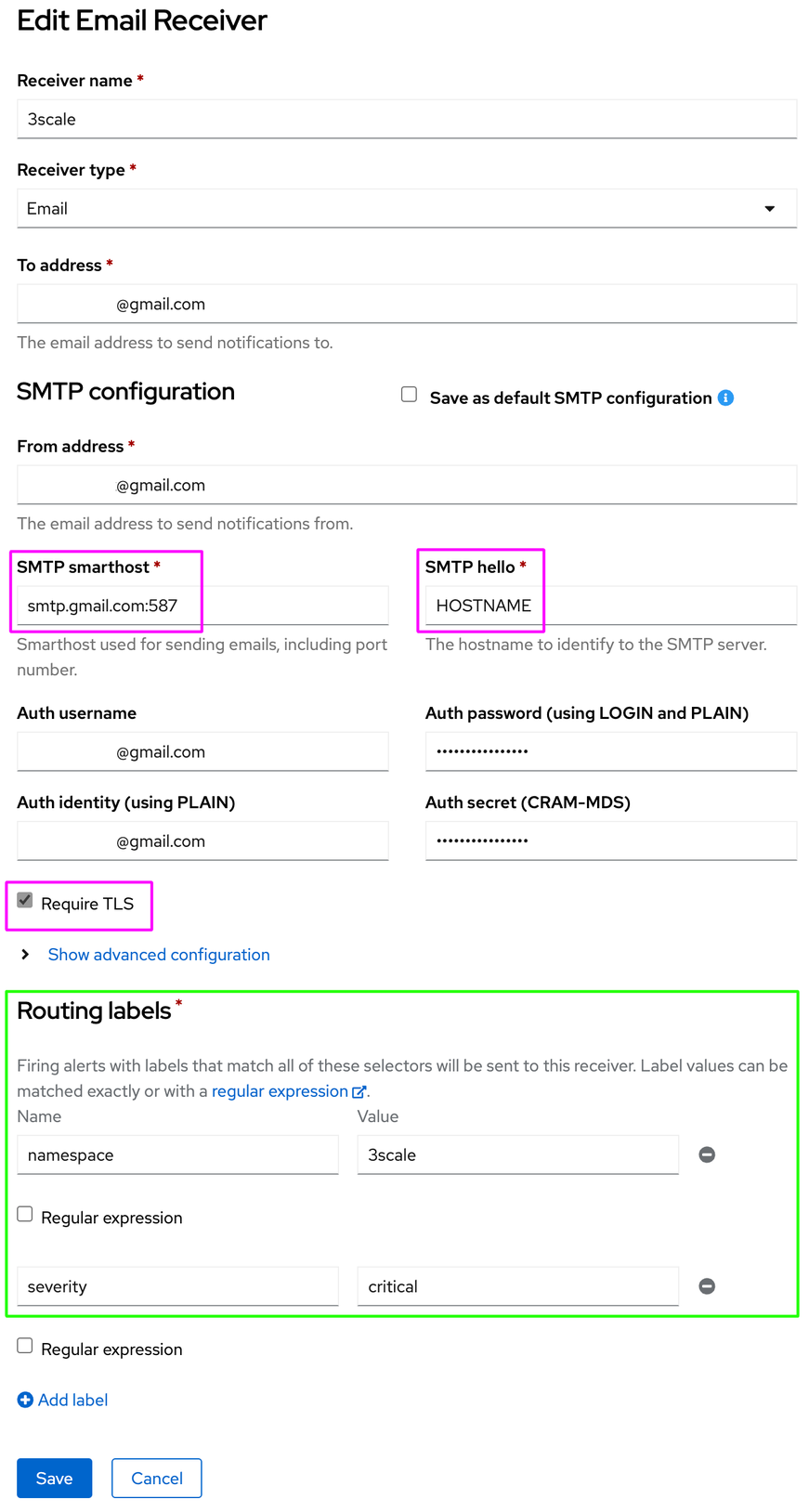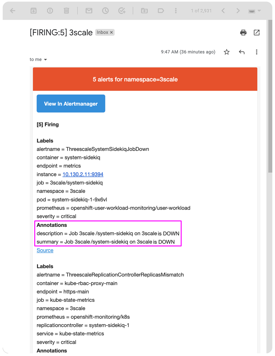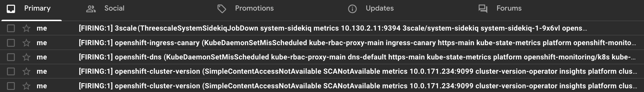 This is the final configuration of alertmanager-main secret that I’ve got as a valid example, working with the Default and 3scale-critical receivers: