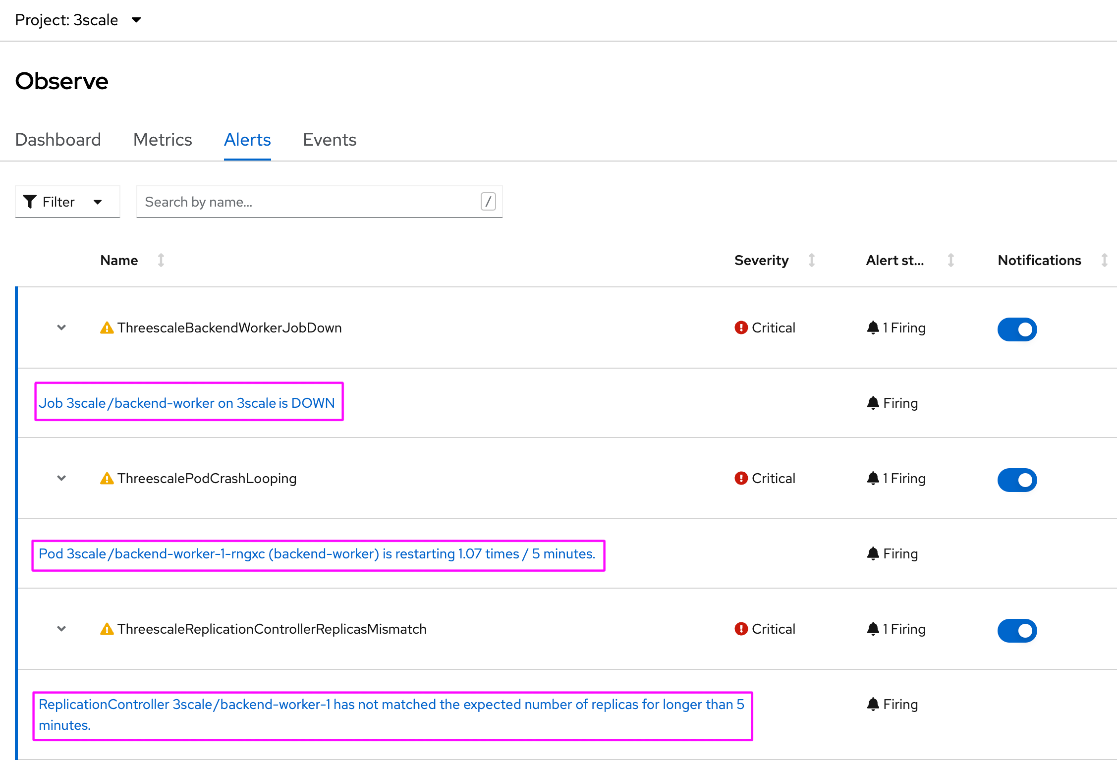 Then, after a few seconds, backend-worker POD will start to show CrashLoopBackOfferrors, and at Observe tab in Developer view, you should see the following alerts being fired: