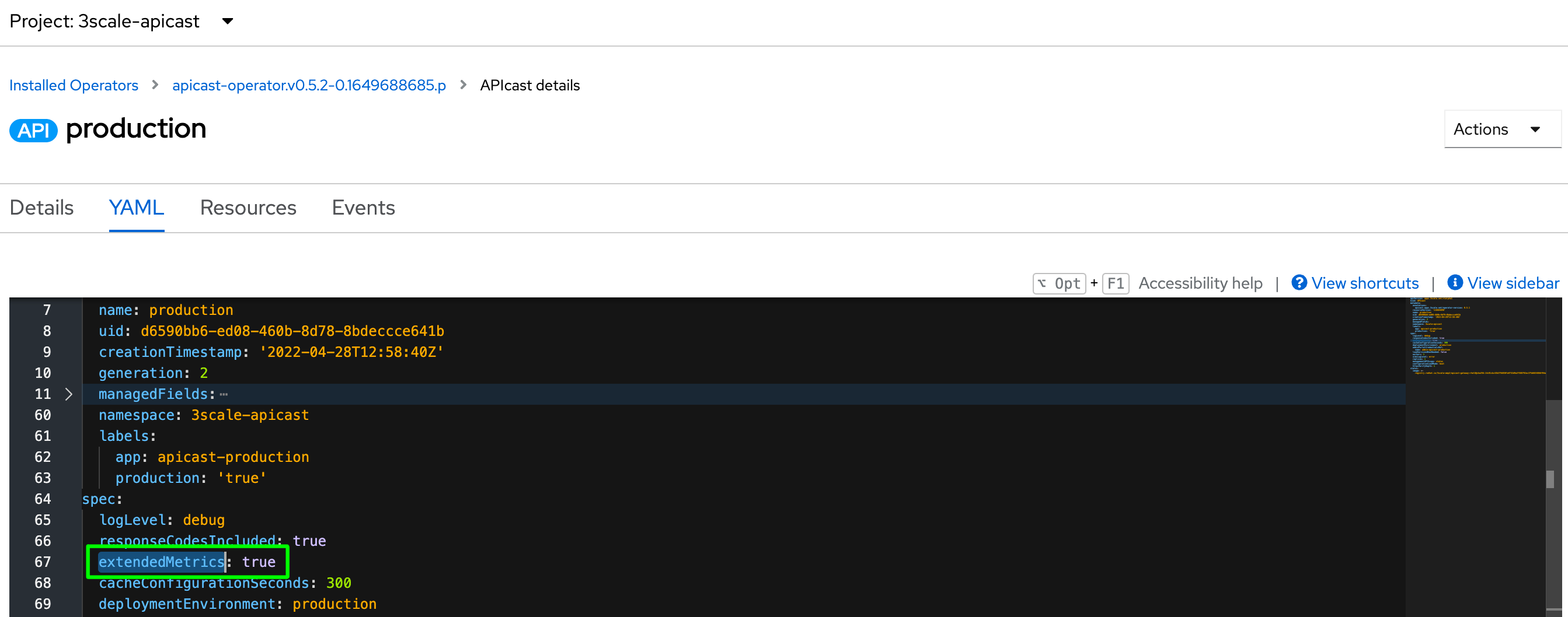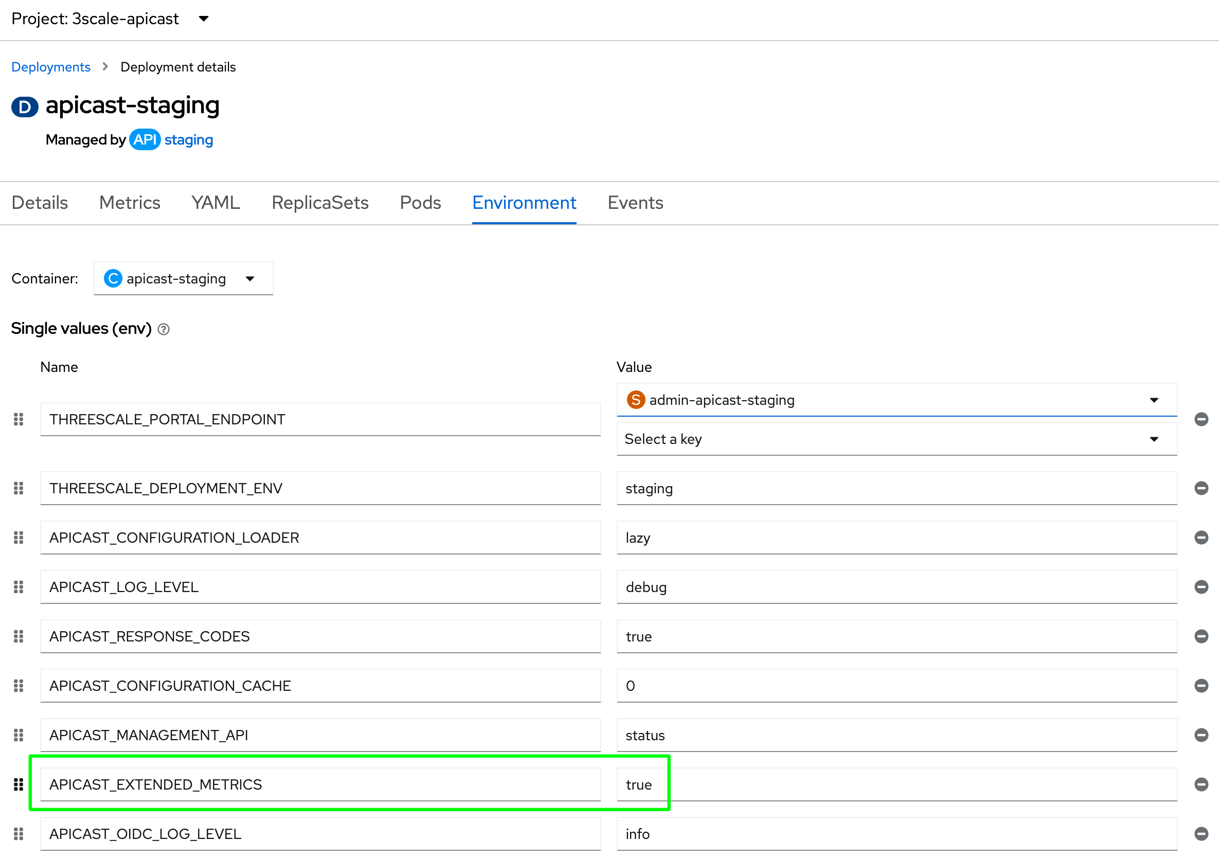 oc set env dc/$STG_GTW APICAST_EXTENDED_METRICS=true -n $x; \