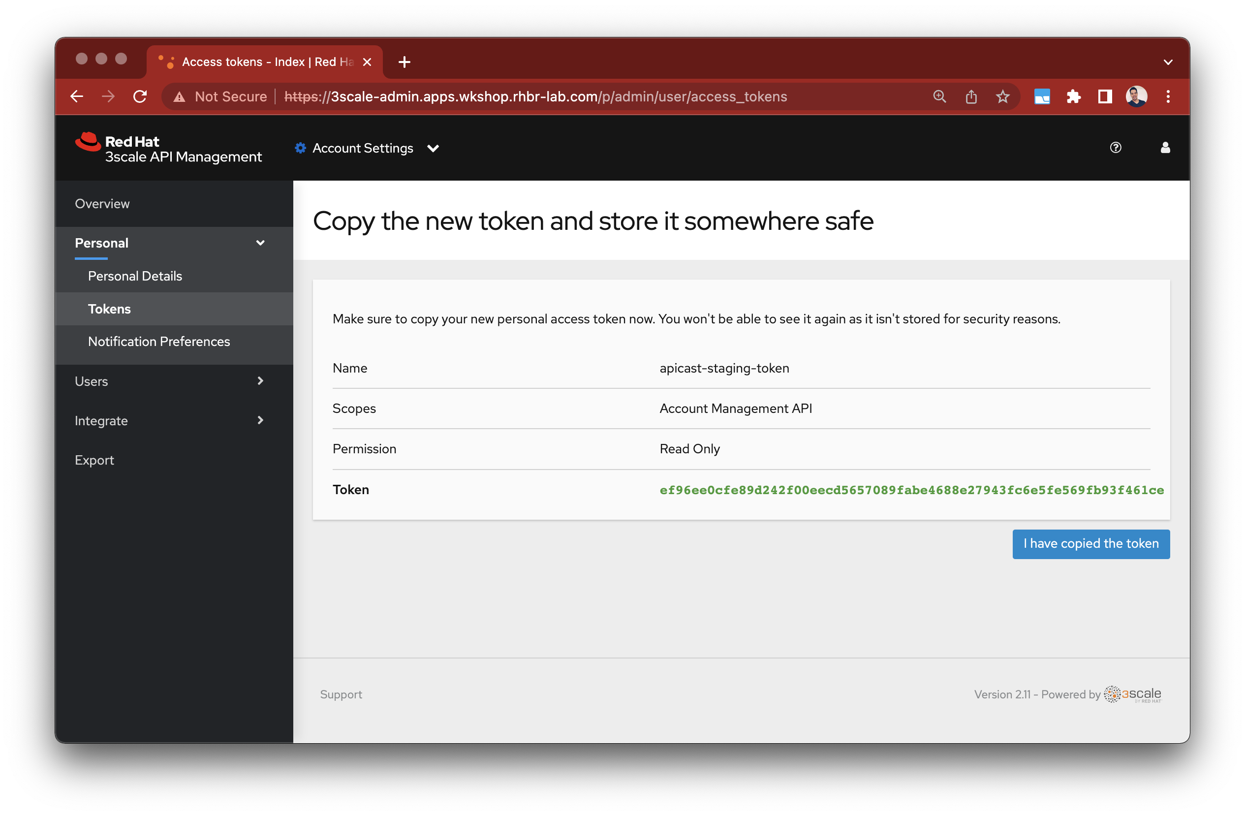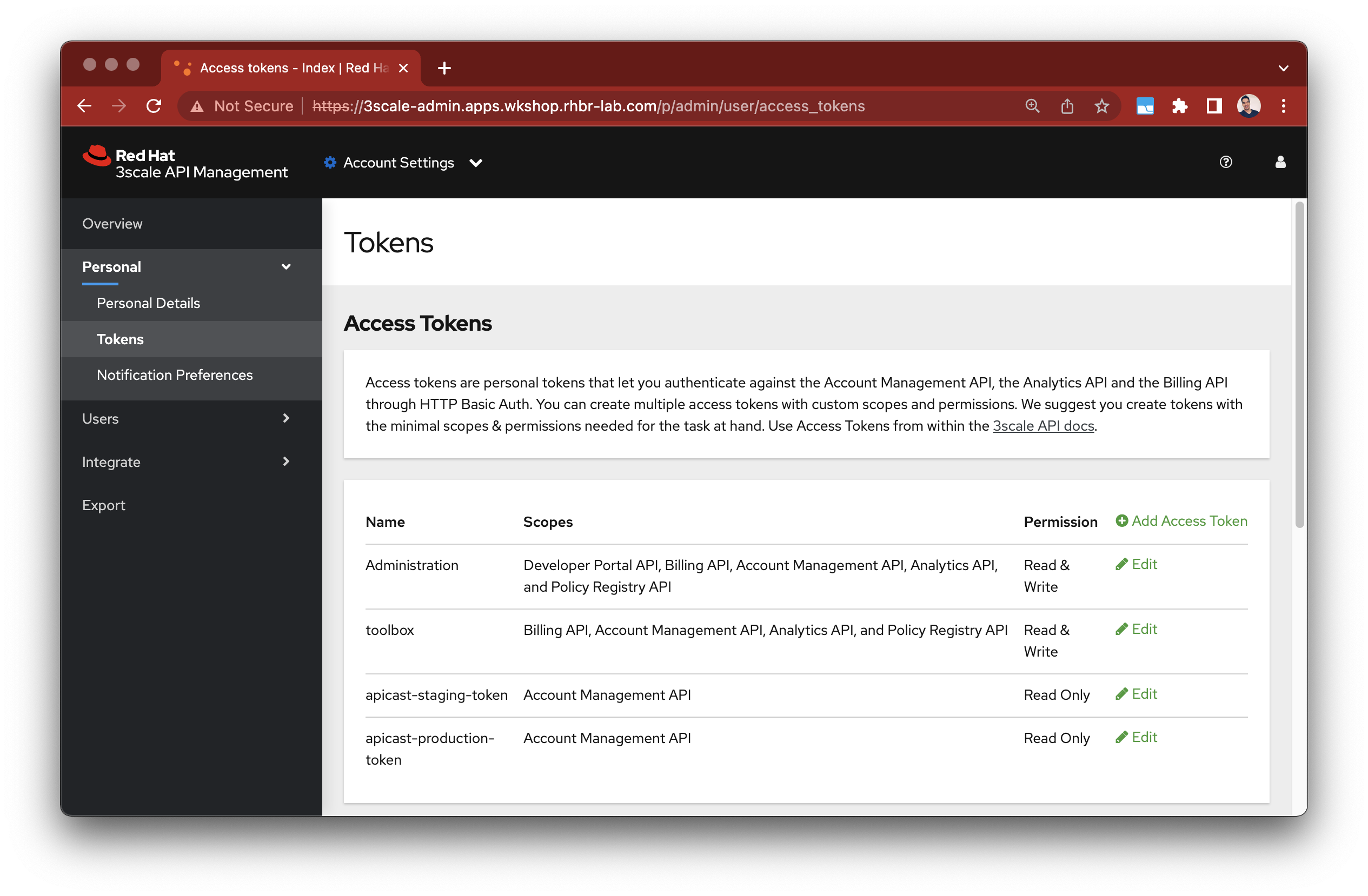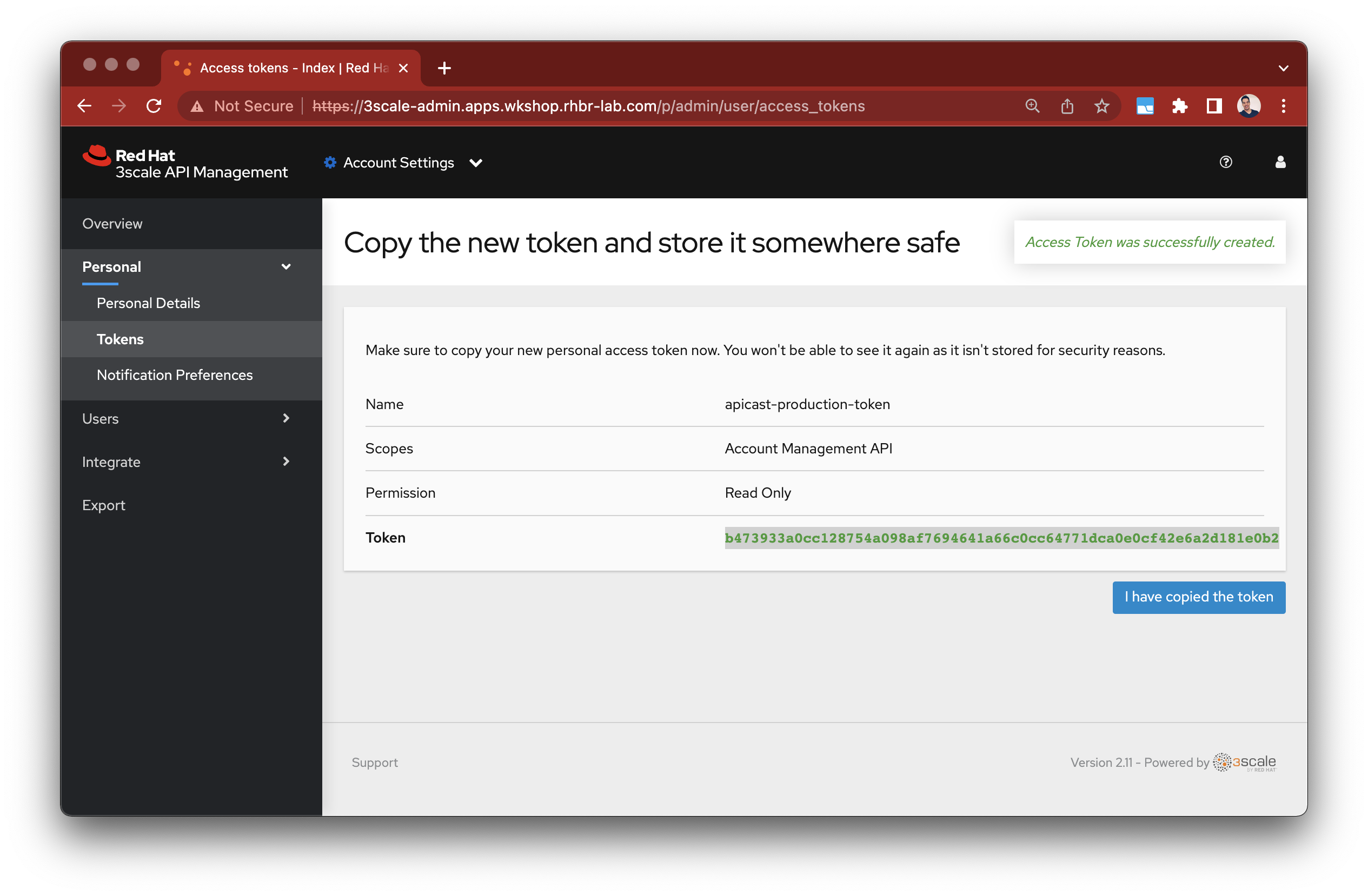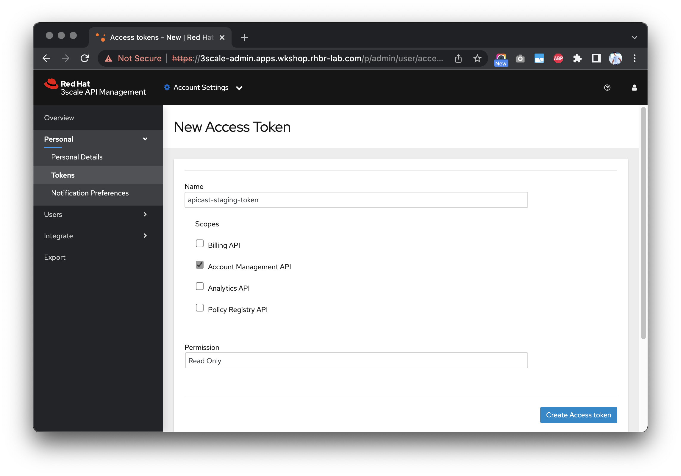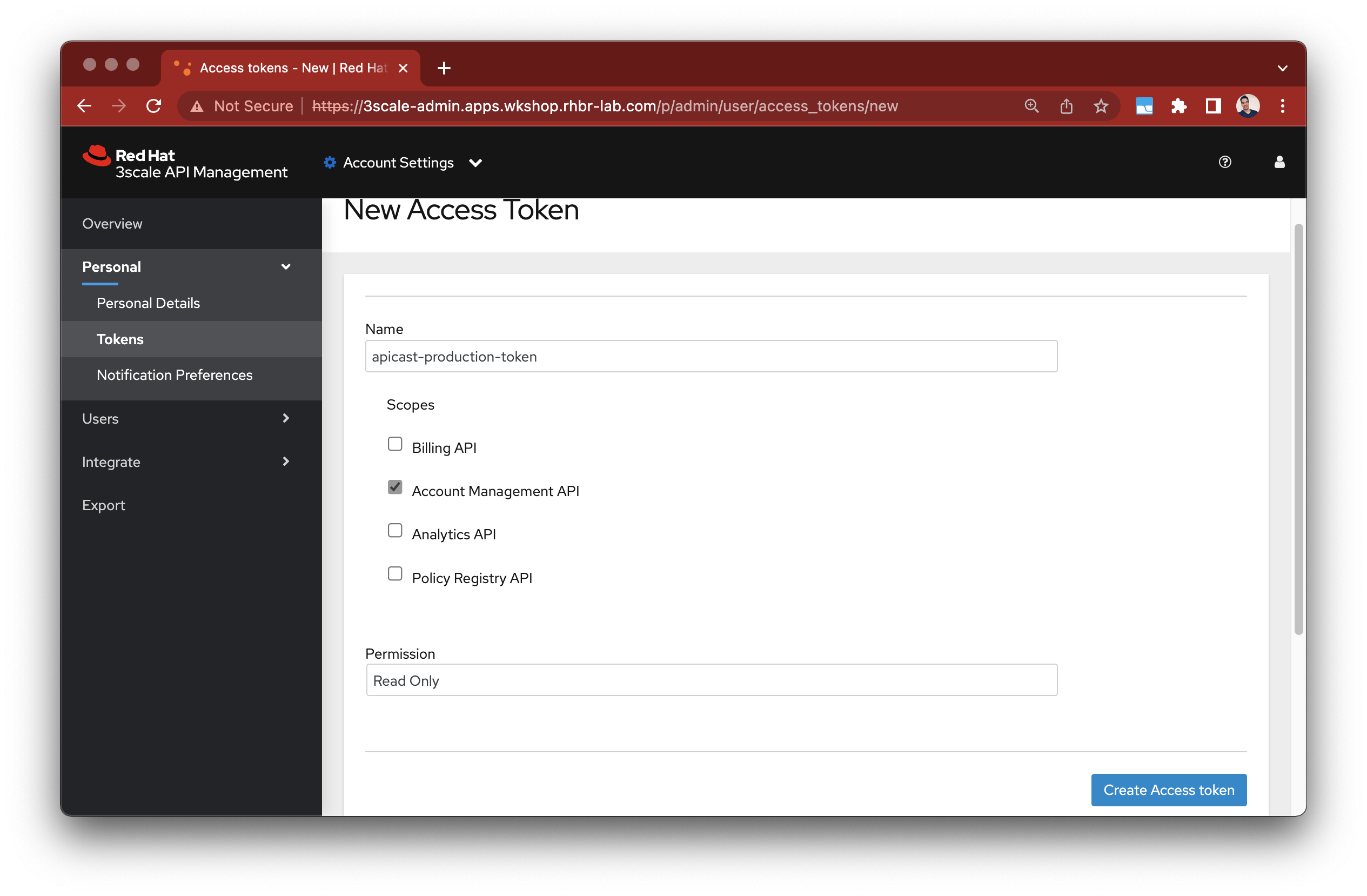 Create new Access Tokens at 3scale admin portal