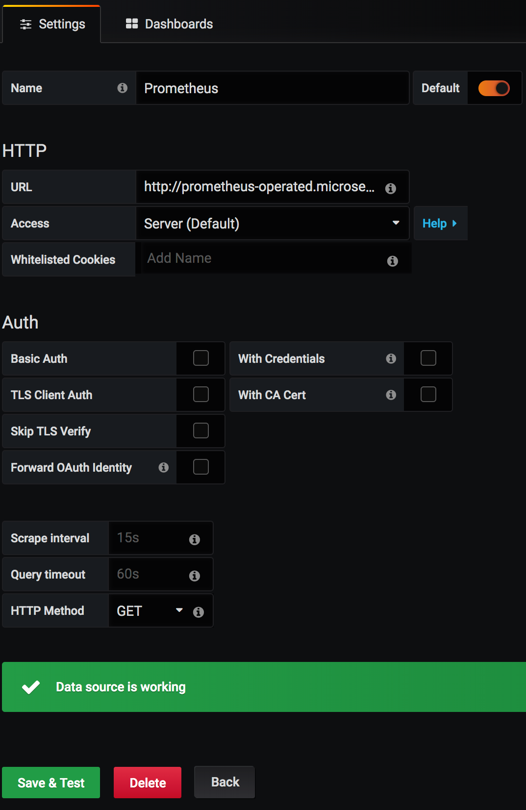 Add a new prometheus datasource with the prometheus service at http://prometheus-operated.microservices.svc.cluster.local:9090, with the following configuration. Click Save&Test, then Back.
