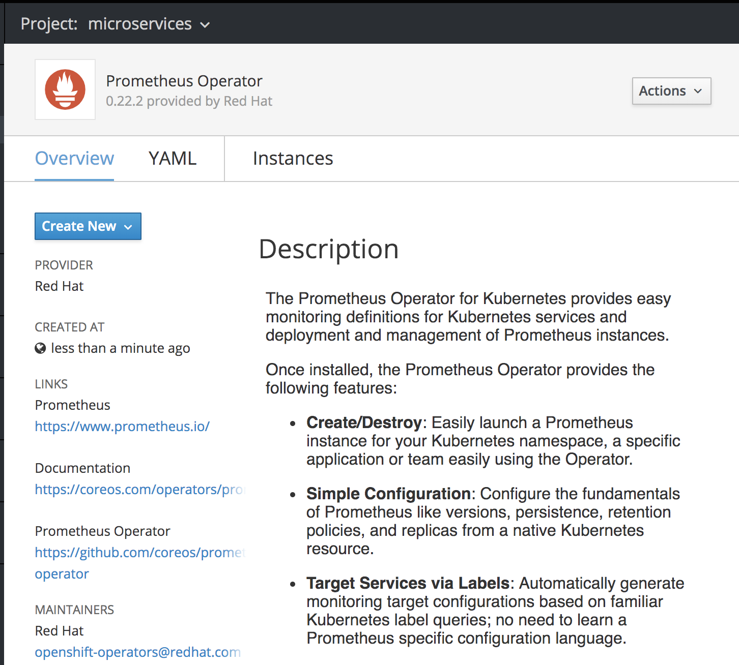 7-Click on the 1 installed link to see Prometheus operator overview tab: