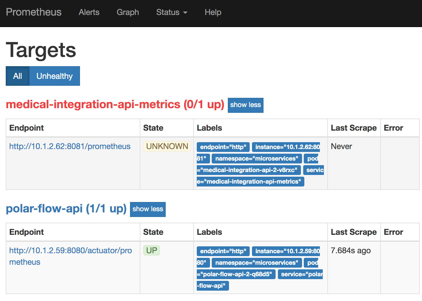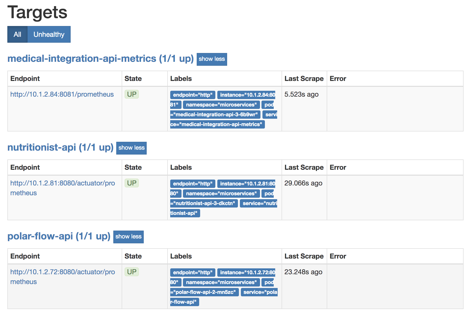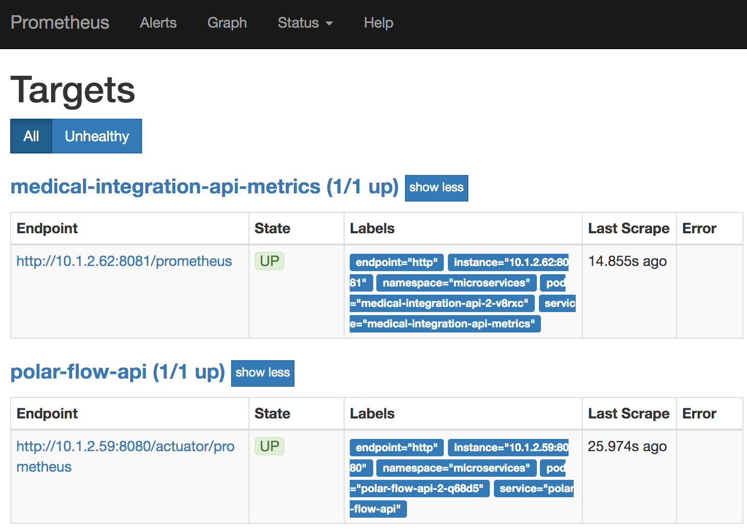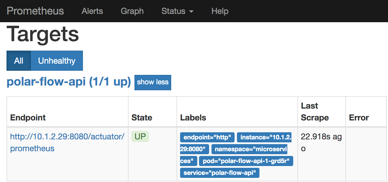 The API can now be discoverable throught Prometheus scrape process, showing it’s state as UP: