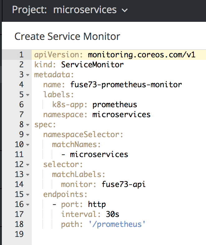 # repeat the initial steps of this tutorial on how to create a prometheus service monitor. Use the following definition to scrape FUSE based application metrics: