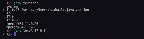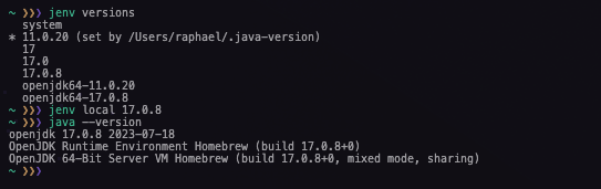 In this example, I’m setting openjdk-17.0.8 as a local scope: